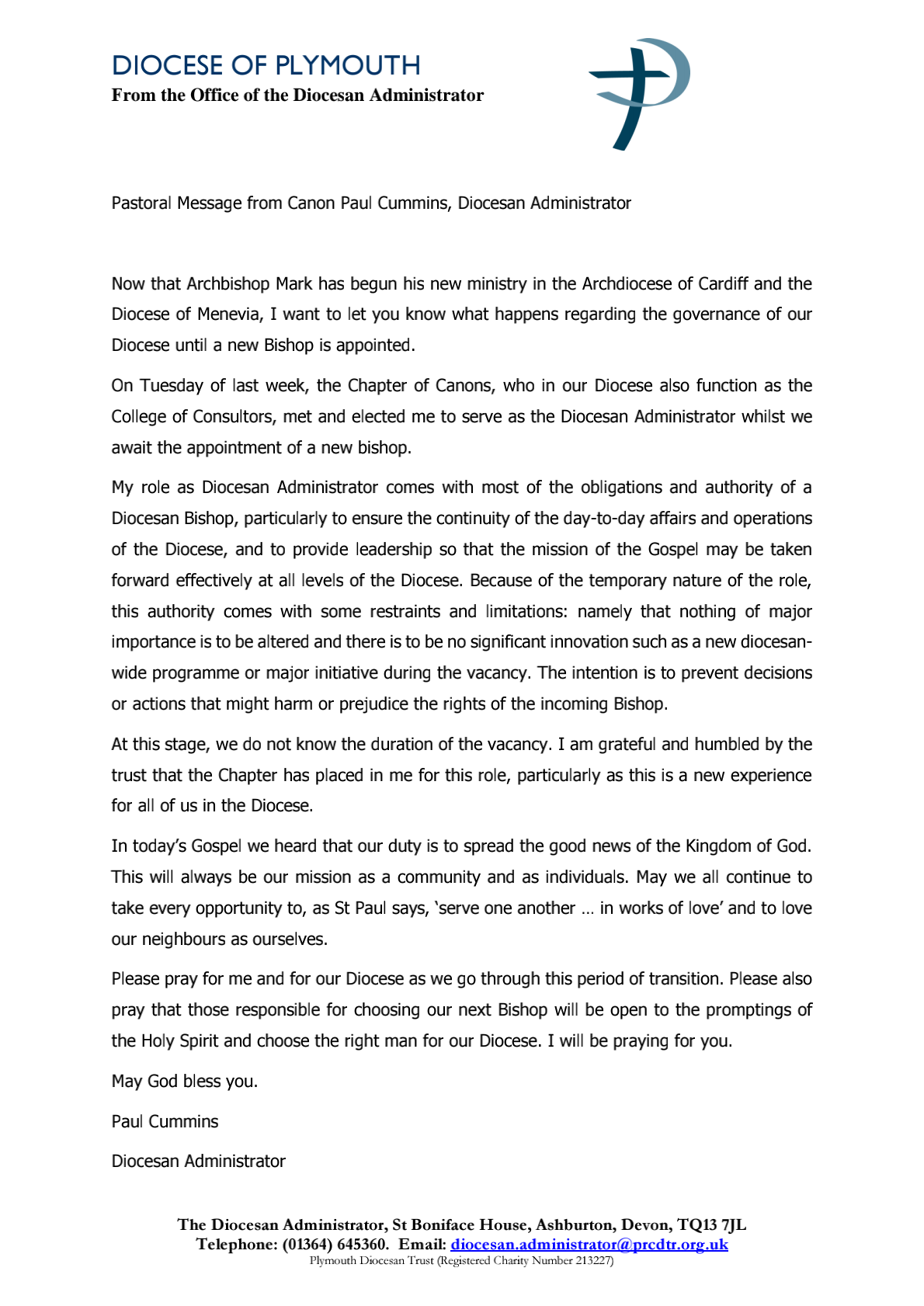 Following immediately on the installation of Archbishop Mark in his new ministry in Cardiff, the Chapter of Canons in Plymouth this week elected Canon Paul Cummins as our new Diocesan Administrator while we await the appointment of a new Bishop for our Diocese. We still do not know when that might be.